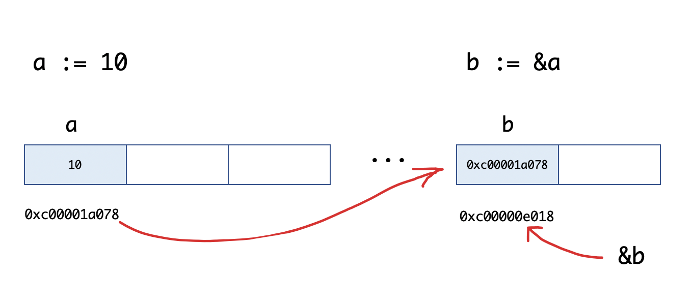 fmt.Printf("a:%d ptr:%p\n", a, &a) // a:10 ptr:0xc00001a078
